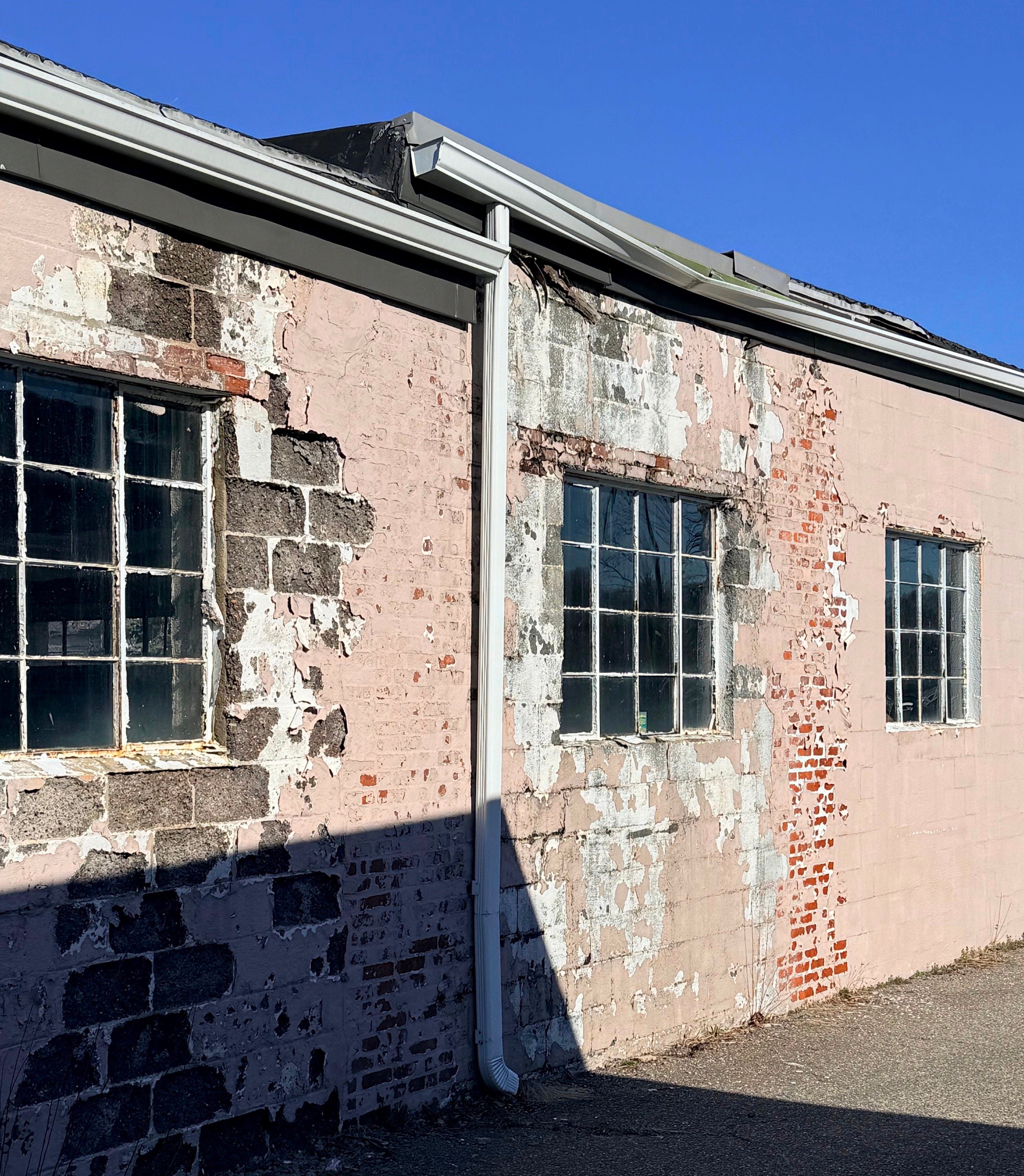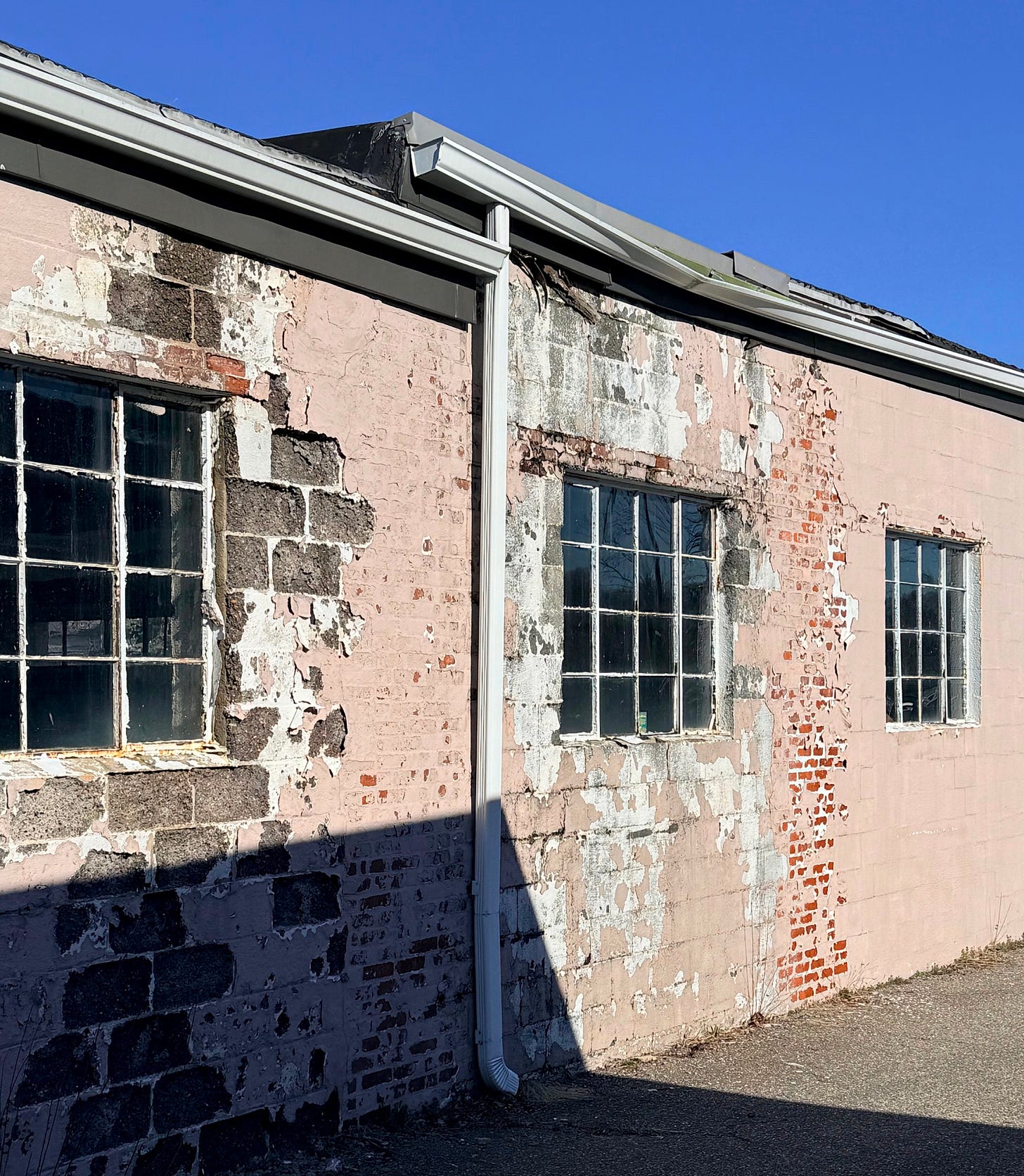 Feed store, machine shop, temporary church, storage for seed, storage for nothing. The wall kept pieces of each version. Pink plaster. Red brick. Black block. Three tall windows with old panes that caught the sky wrong. And on the corner, a white gutter so new it looked borrowed from the set of infomercial.