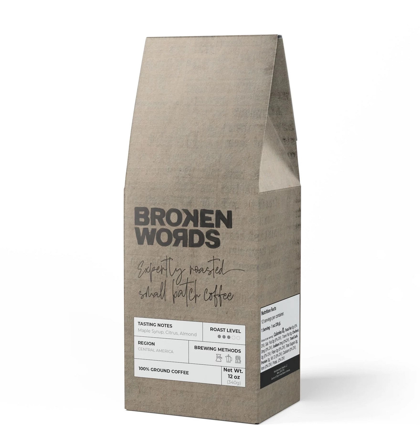 Broken Words Coffee (Medium Roast). Slow-burn sweet. Think chocolate-covered almonds, a bit of maple, a whisper of citrus. Twelve ounces, roasted stateside. It sold out right out of the gate which says something about your caffeine needs and our collective taste. Restock is on the way.